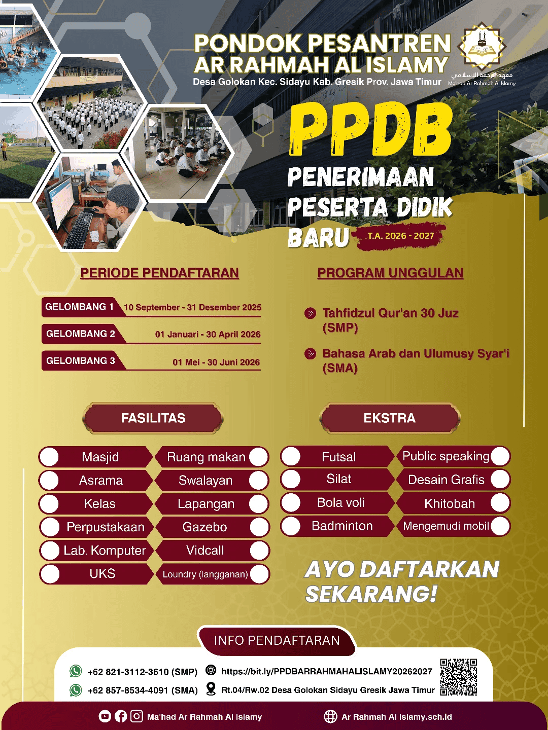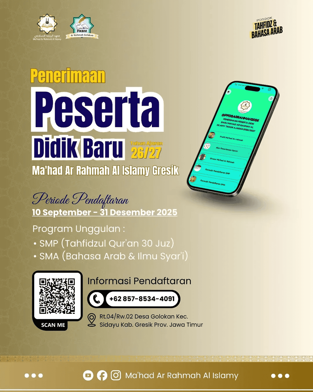 Ahlan wa Sahlan di Laman Resmi Ma'had Ar-Rahmah Rumah bagi santri yang mengukir masa depan dengan cahaya Al-Qur’an dan adab.